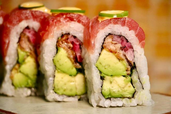 Kani, cucumber, avocado, topped with Tuna, Salmon and Yellowtail -