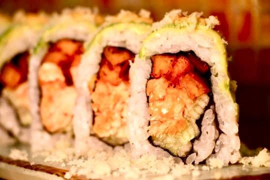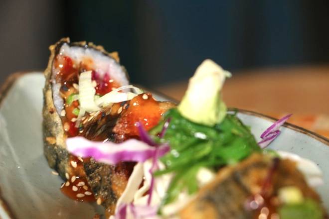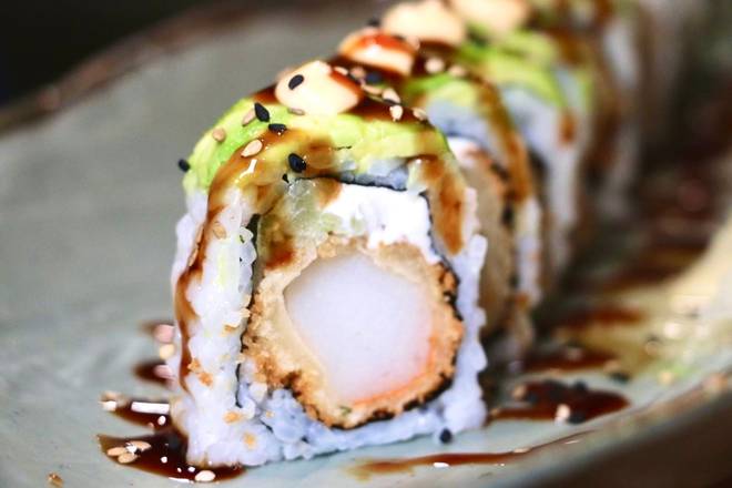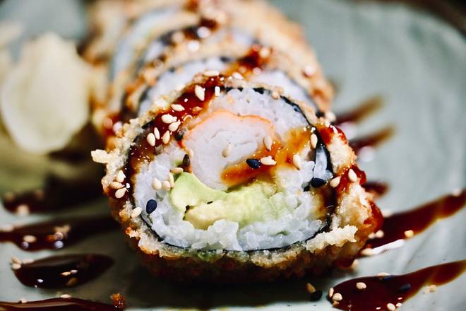 Kani, cucumber, avocado crispy tempura fried outside topped with eel sauce and sesame seeds