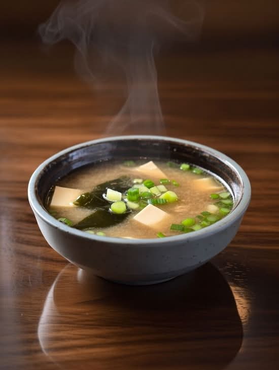 White miso vegetable broth with bits of tofu, seaweed and fresh scallion.