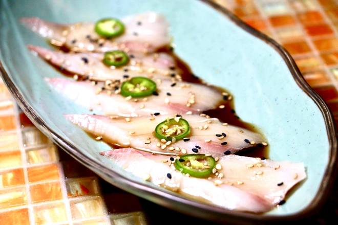 Yellowtail Sashimi served with ponzu sauce, serrano peppers and sesame seeds -