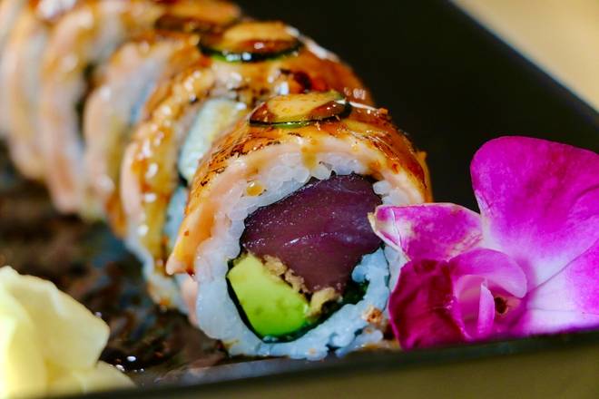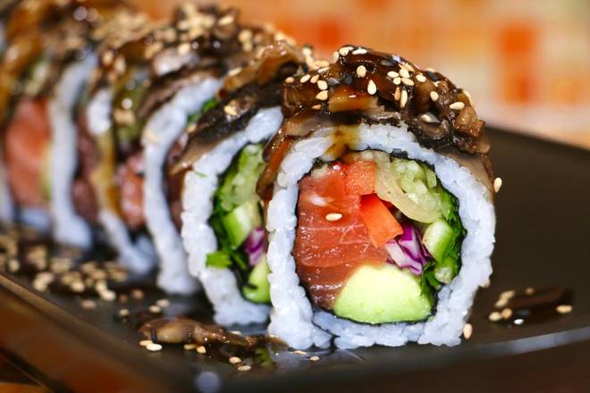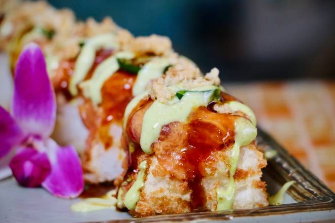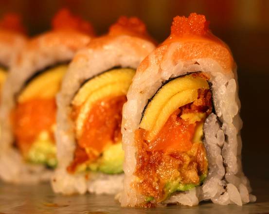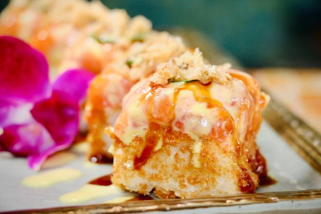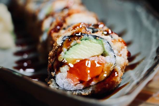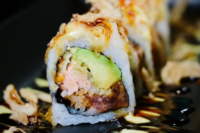 Raw Salmon, avocado, crispy tempura fried outside topped with eel sauce -