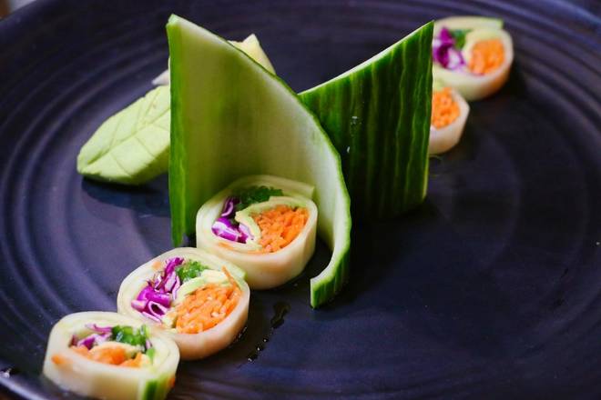 Avocado, carrots, wakame, red pepper, lettuce, rice vinegar wrapped in cucumber