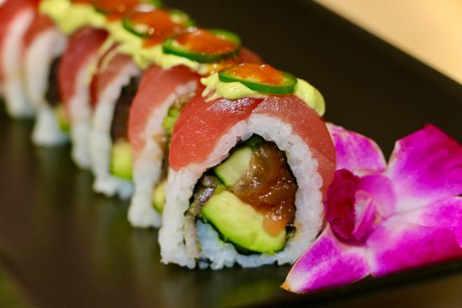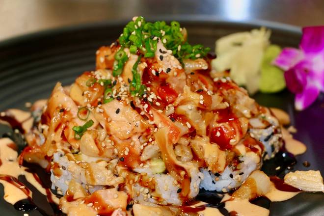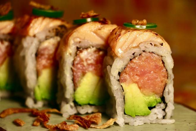 Spicy Tuna, avocado, scallions, topped with torched salmon, serrano peppers, crispy onions and truffle oil -