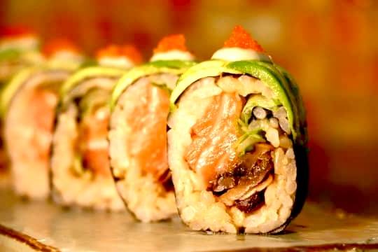 Salmon, teriyaki mushrooms, lettuce, scallion, brown rice, nori on the outside topped with avocado, garlic aioli, sesame oil and masago -