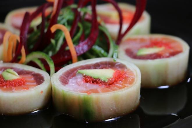 Salmon, Tuna, Yellowtail, avocado, masago, wrapped in cucumber and ponzu -