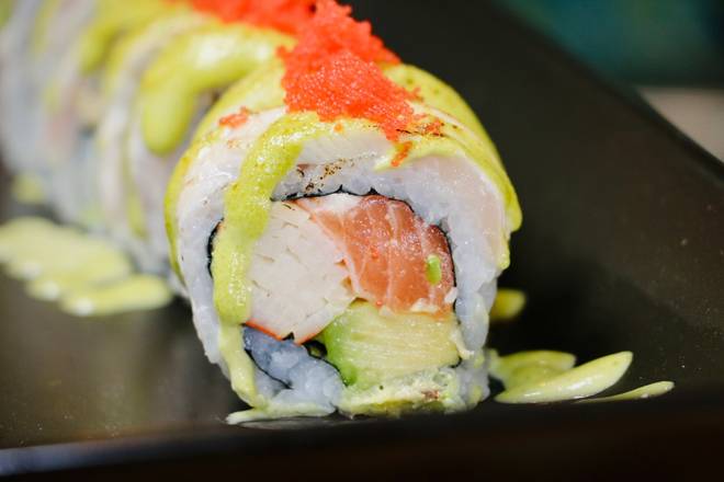 Salmon, avocado, spicy kani, topped with torched Yellowtail, cilantro aioli, spicy mayo and masago -