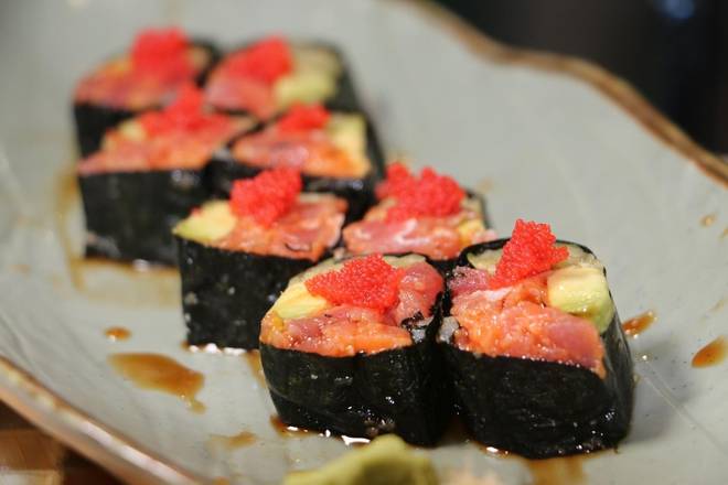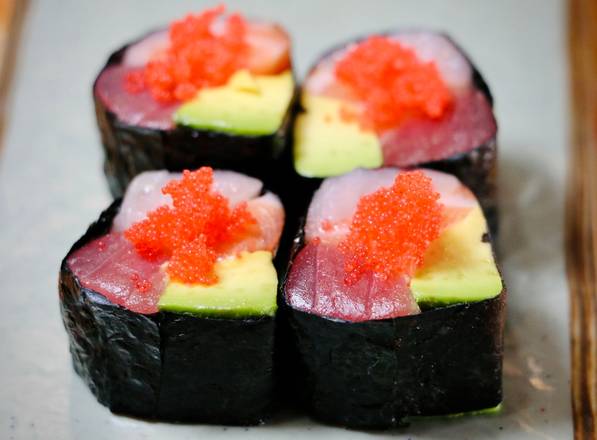 Tuna, Salmon, Yellowtail and avocado, topped with masago -