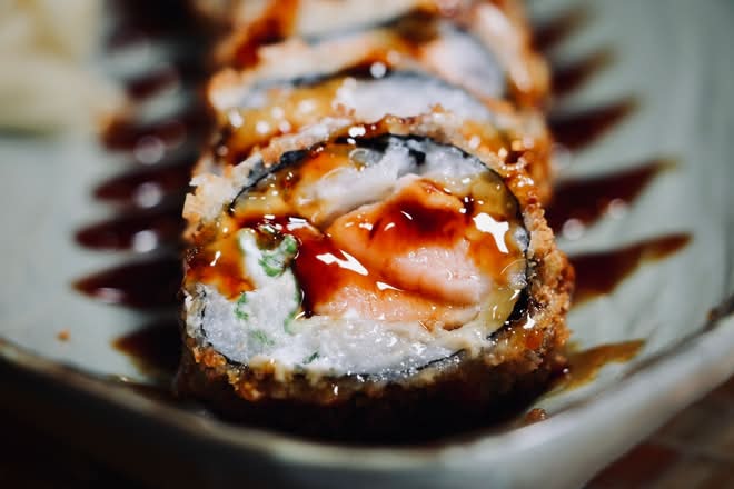 Raw Salmon, vegan cream cheese, scallions, crispy tempura fried outside topped with eel sauce -
