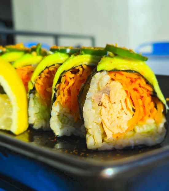 Baked seasoned Salmon, avocado, cucumber, carrot, cilantro, nori on the outside, brown rice, topped with serrano peppers, served with a fresh lemon wedge -